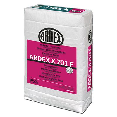 ARDEX X 701 F er en fleksibel fliseklæber, inden- og udendørs, som anvendes til klæbning af fliser og klinker af keramik, stentøj, særligt finstentøjsfliser og mosaik af glas og porcelæn samt til klæbning af lette skillevægs-, isolerings- og facadeplader.