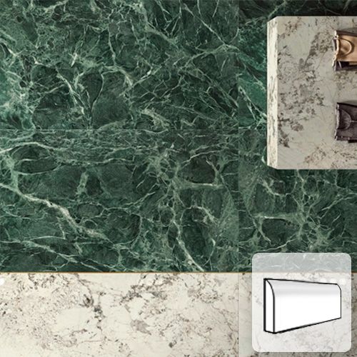 Eksklusive keramiske sokkelfliser med marmor look i utrolige farver. Sokkelfliserne har afrundet overkan, som giver en lækker finish til dit flisegulv.