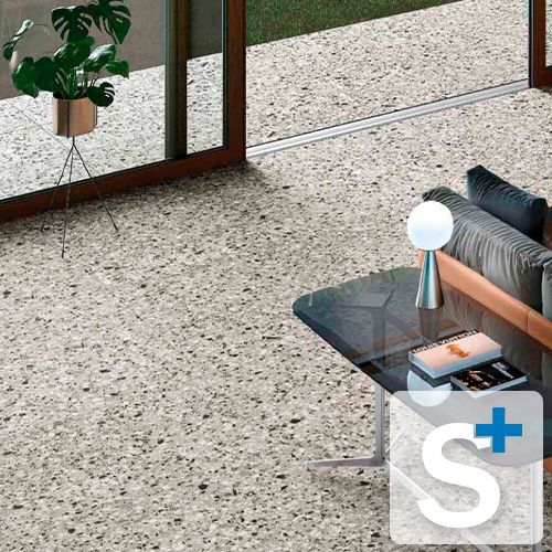 Flisen er italiensk produceret, og ligner en moderne udgave af de originale venetianske terrazzofliser.