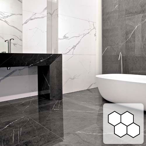 Marmoker Esagoni er sekskantede fliser som kommer på net á 21,5x25 cm.