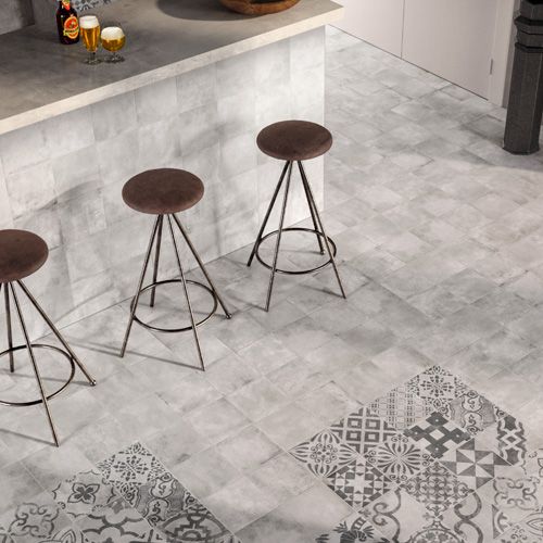 Disse gulv og vægfliser kan let kombineres mønstre og ensfarvede imellem. Her kan for eksempel laves et mønster med en ramme omkring i ensfarvede fliser, for at give indtryk af et flisetæppe.