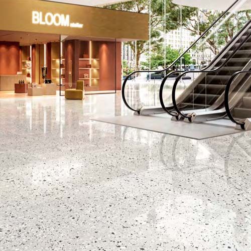 Denne serie af keramiske fliser med terrazzo look kan med en smal fuge give oplevelsen af en helstøbt flade i terrazzo.