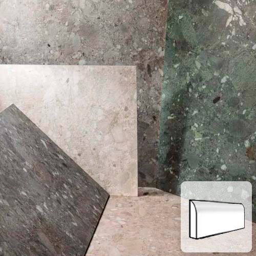 Flisen fås som alm. flise, sokkelflise med afrundet overkant og som storformatflise.