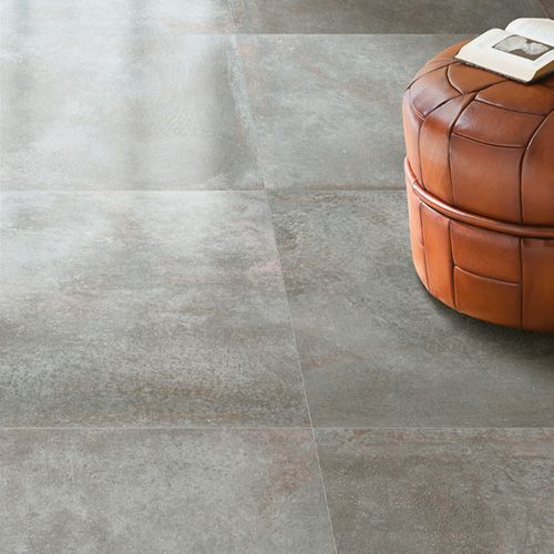 I nogle farver har disse gulvfliser metallisk klang, mens de i andre farver minder mere om strøget eller pudset cement.