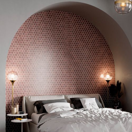 Materia Prima flisen fås som sekskanter, sekskanter på net, sekskanter på net i mix-farver, romber på net, romber på net i mix-farver, og firkantede fliser.