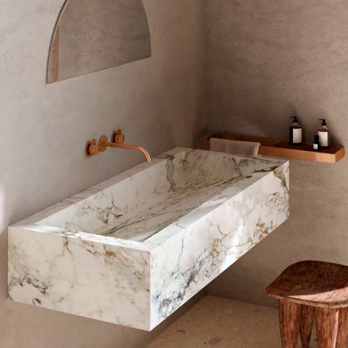 Håndvask i keramiske fliser fra Fondovalle Infinito serien. hele konstruktionen er belagt med fliserne, også på indersiden af bassinet.