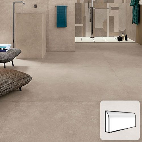 Flisen fås også som sokkelflise med afrundet overkant og som storformatflise.