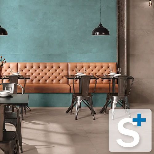 Hertil fås den i mange toner af sandfarvet og beige, samt en cotto-farvet og en petroliumsblå i 60x120 cm.
