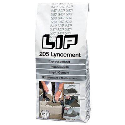 LIP 205 Lyncement er en cementbaseret standfast Úuniversalspartelmasse til bl.a. hurtig fastgørelse af Ústålbolte og lignende samt til reparation af beton, Úkunst- og mursten, puds og murværk og slidlag.