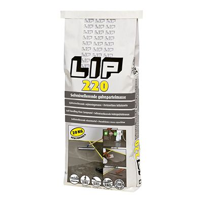 LIP 220 Gulvspartelmasse anvendes til nivellering, opretning og finspartling af beton, pudslag, naturÚsten, keramiske fliser, klinker, træ og lign. På metal, støbeasfalt, epoxy og lign. kan LIP 220 udlægges når underlaget først er primet med LIP Supergrund. Fra 2 mm til enhver ønsket lagÚtykkelse. Er velegnet i forbindelse med gulvÚÚÚvarmesystemer. LIP 220 Gulvspartelmasse er ikke fugtskadestabil, og kan derfor ikke anvendes udendørs. I vand/fugtbelastede områder skal LIP 220 være påført en godkendt vandtætningsmembran.