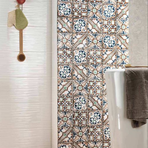 Denne keramiske flise kommer i kasser af blandede mønstre. Det er tilfældigt hvilke mønstre man får, dog vil der i enhver kasse altid være minimum én flise med hvert motiv.