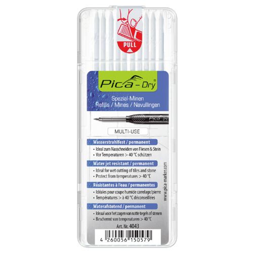 Til markering af fliser, klinker og natursten. Ekstra stifter til Pica Dry Pen Dybhulsmarkør, som også kan købes her på siden og i butikken.