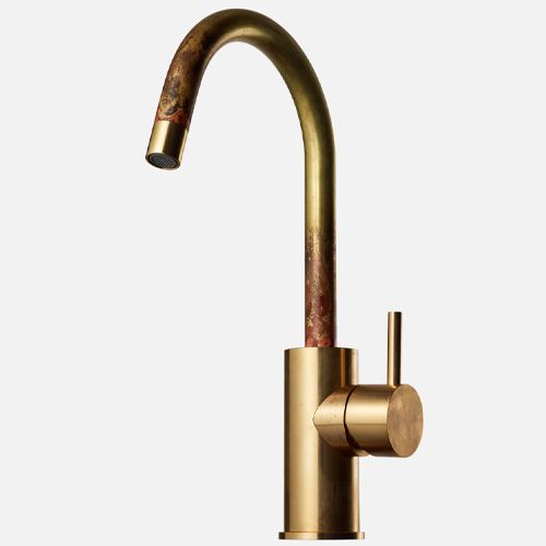 Grottesco er lavet af ægte messing, som er delvist broneret i flammet udtryk. Den vil derfor kunne få noget patina, som gør den æstetisk vintage. Den specialt designede overflade giver et unikt udtryk til hvert enkel vandhane, og overfladen vil variere fra produkt til produkt.
