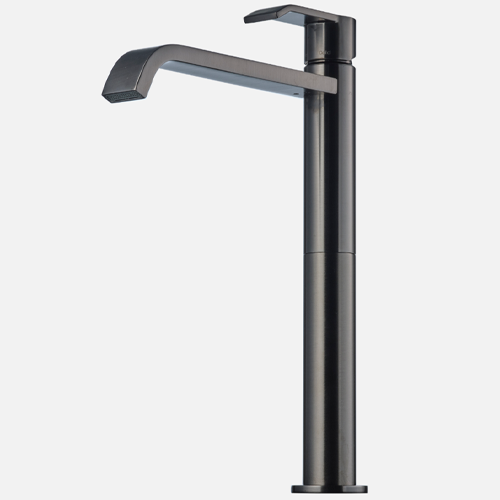 Tapwell Vic081 er et håndvaskarmatur med høj, slank hals og lang, flad tud. Vandhanen er lavet på en bund af messing belagt med en sort, børstet metaloverflade.