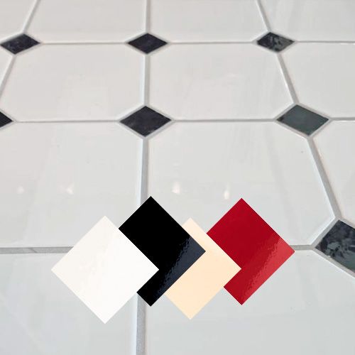 Diamante serien fås som metrofliser, som ottekantede fliser med tozzetto dots og som kvadratiske fliser.