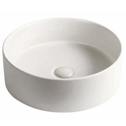 Fritstående, hvid, mat, rund porcelænsvask til bordplade i badeværelse.